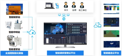 全流程智能化装备部署在施工现场,是核心执行装备,包含制浆、送浆、灌浆全流程软硬件系统,实现了从制浆、送浆、灌浆全流程的信息感知、实时分析、联动控制。